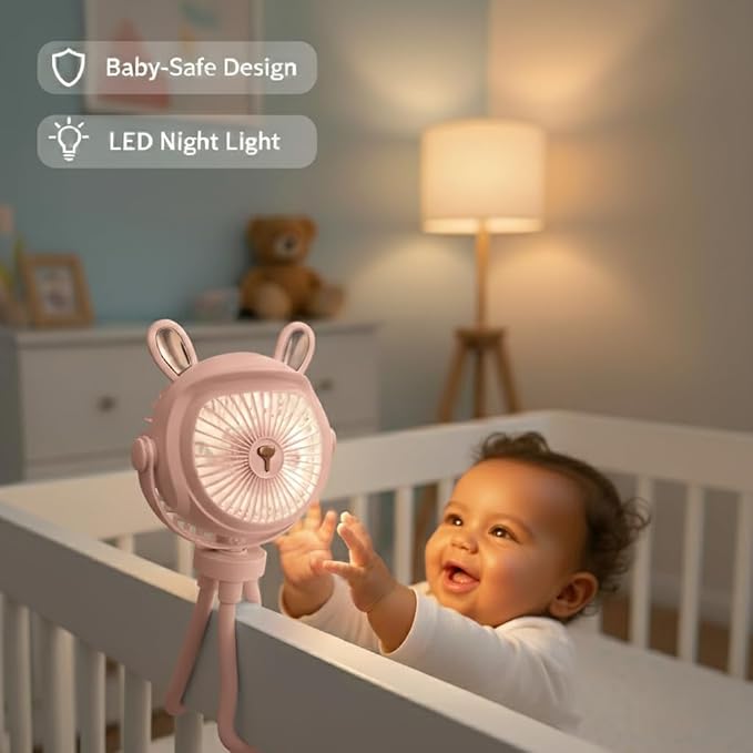 Stroller Fan for Baby with LED Light – Portable Clip-On Fan with Flexible Tripod Legs, USB Rechargeable, 3 Speeds, 120 Minutes Battery Life, Quiet Cooling for Travel, Nursery & Car Seat