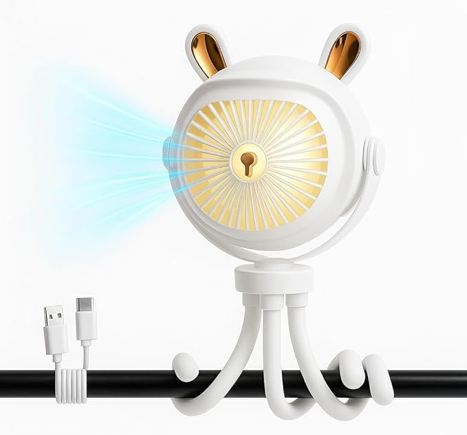 Stroller Fan for Baby with LED Light – Portable Clip-On Fan with Flexible Tripod Legs, USB Rechargeable, 3 Speeds, 120 Minutes Battery Life, Quiet Cooling for Travel, Nursery & Car Seat