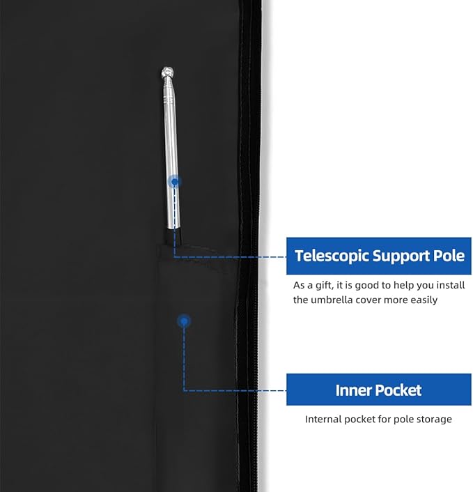 - 【EASY TO INSTALL】When installing an offset umbrella cover, you may encounter a situation where the umbrella is too high to reach the zipper. Patio umbrella outdoor covers have a rope on the zipper, so when the zipper head is high, it is easy to use the rope to pull up the umbrella cover. A retractable pole is placed in the bottom pocket, making it easy to lift and remove the offset umbrella cover, install the umbrella cover without the need for a ladder