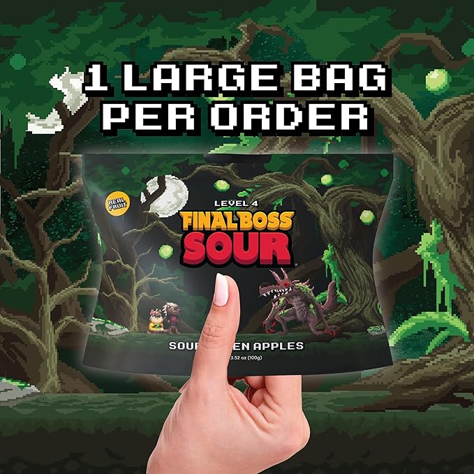 - CHALLENGE YOUR TASTE BUDS, GREEN APPLE FLAVOR: with Final Boss Sour Candy Green Apple, Level 4—our most intense sour adventure yet! These natural fruit chews are crafted with real dried fruit, cane sugar, and sunflower oil for a delicious, low-calorie snack. Perfect for kids, teens, and adults, these individually wrapped candies are ideal for lunch boxes, on-the-go snacking, parties, or daring your friends to conquer the ultimate sour challenge.