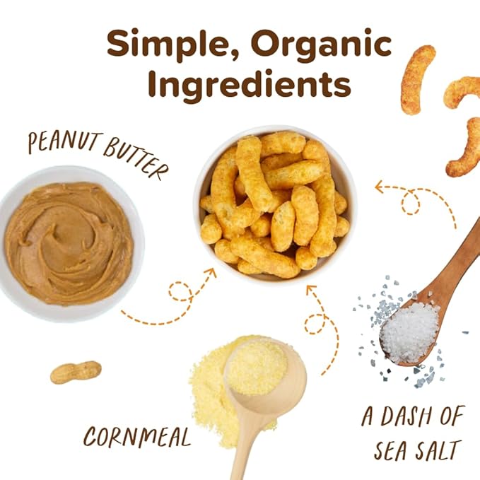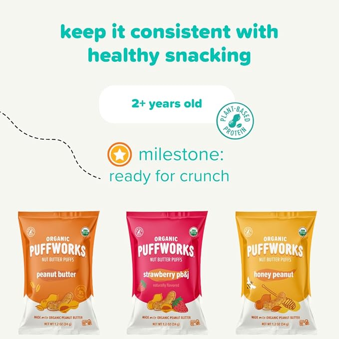 - Contains 6-1.0 Ounce Bags of Puffworks baby Organic Nut Butter Puffs (6 peanut butter, 6 almond butter), an easy way to introduce peanut and almond to baby early and keep snacking healthy
