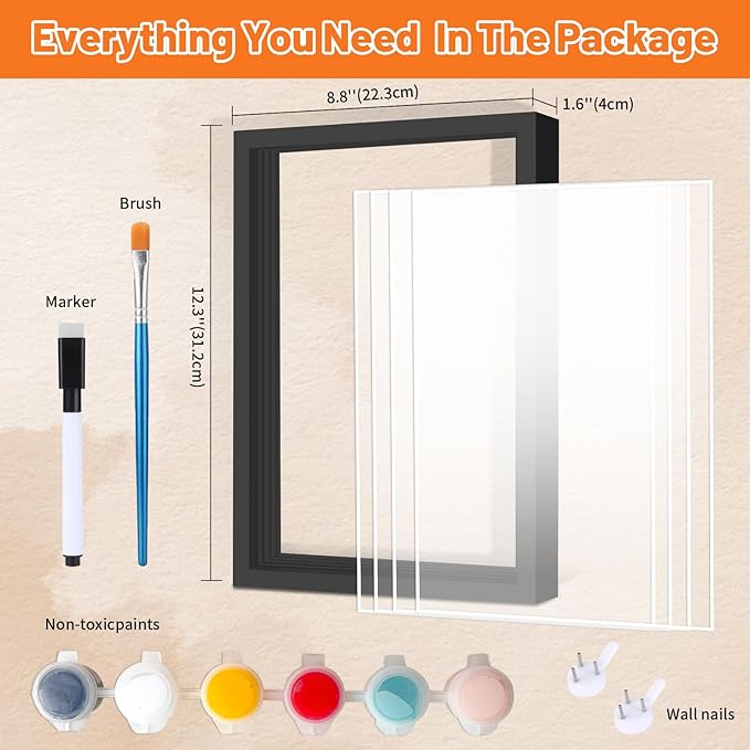 - 【Quality Family Handprint Kit】: This hand casting kit includes all the accessories you need:1 frame with 4 thickened acrylic glass sheets; 1 brush ; 1marker pen; 2 wall nails and 6 color paints which can be easily wiped and washed off.It has a extra transparent dust sticker to prevent dust from falling into the top grooves.