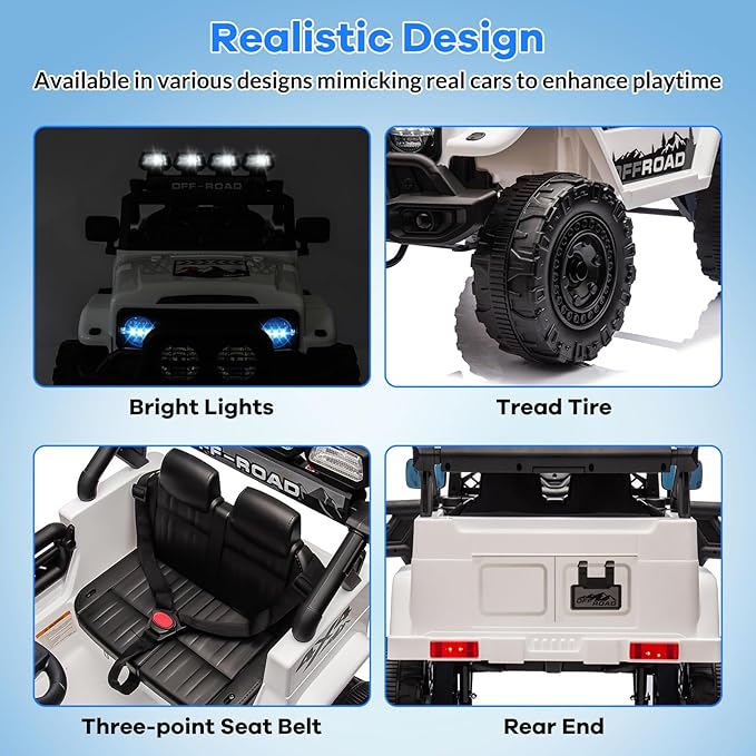 - [REALISTIC DESIGN] – GarveeLife’s 4-wheeler sports lifelike automotive styling, featuring vivid LED headlights and taillights, rugged treaded tires, a secure three-point seat belt, and an authentic front bumper to make every drive feel true to life