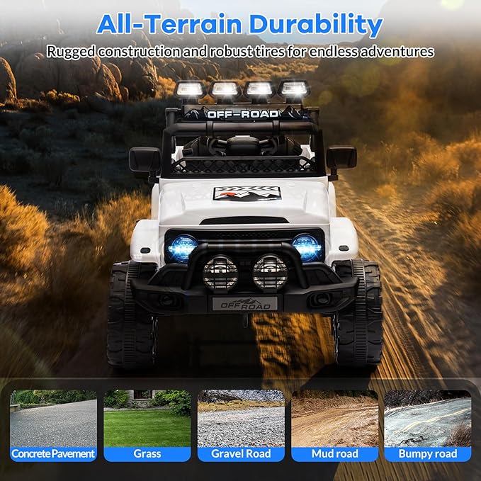 - [SAFE & DURABLE] – Built from robust materials to tackle concrete, lawns, and rocky paths, the ride-on includes a smart parental remote that overrides steering and braking, ensuring every outing is both exciting and secure