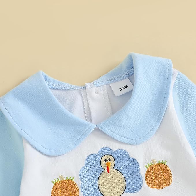 • Feature: Our baby fall footie romper is adorable, long sleeve with mitten cuffs, doll collar footies, pumpkins, turkeys,mallard duck embroidery match with white and pink or white and blue checkered or solid color background, one-piece cotton footie, an old-fashion and cute fall clothes for baby boys and baby girls