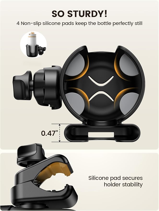 - 【Anti-Slip Secure Hold】 Built with 4 inner silicone grips, this cup holder for stroller keeps your drinks steady—even on uneven sidewalks or bumpy trails. Perfect for baby bottles, travel mugs, insulated cups, water bottles, and coffee cups. No more spills while you're on the go.