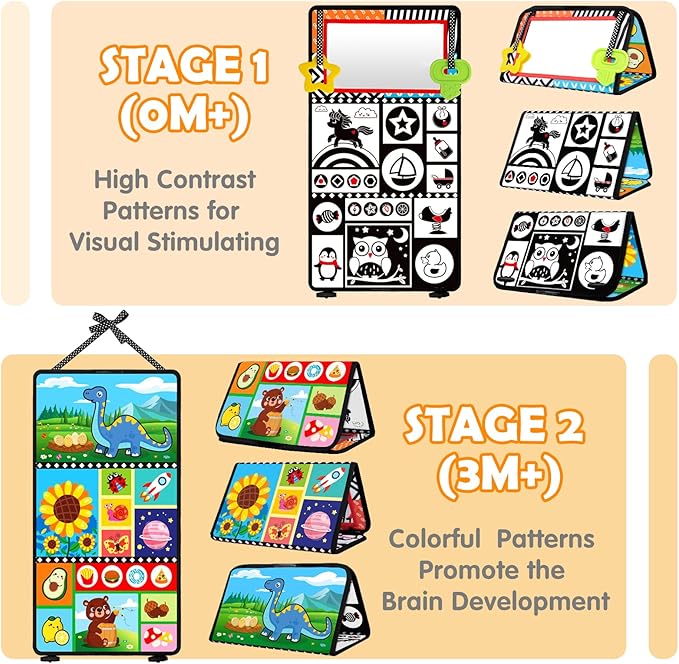 - Educational Toys for Brain Development: This tummy time toy is suitable for babies aged 0-12 months. The high contrast black and white patterns are perfect for newborns (0-3 months), capturing their attention and supporting early visual development. For babies over 3 months, the colorful patterns stimulate their growing senses and encourage motor skill development