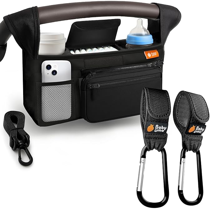 - Chaos out, order in: Stay organized on the stroll with Baby Uma's universal stroller organizer bag & stroller hook bundle! The stroller caddy with cup holder keeps everything in its place, while the 2 pack of stroller hooks frees up your hands.