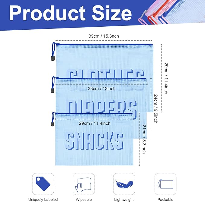 - Three Practical Sizes for Essential Needs - Includes three zipper bags in different sizes to accommodate your needs: Large (44x32cm / 17.3x12.6 inch) for clothing; Medium (39x29cm / 15.3x11.4 inch) for diapers;Small (33x24cm / 13x9.5 inch) for snacks or small items
