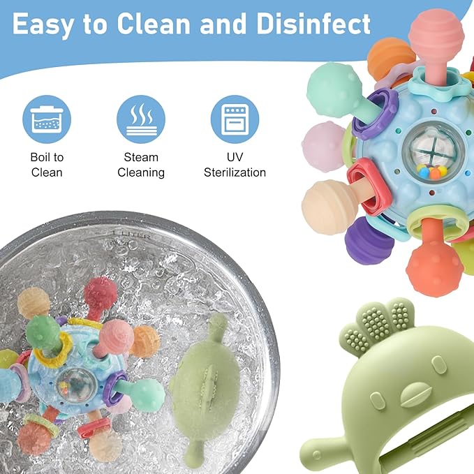 - 【Food-Grade Silicone Baby Teether】Our baby teether toys are made of food-grade silicone and ABS plastic, non-toxic and BPA-free, so you never have to worry about harmful chemicals. Safe for chewing, they help soothe baby’s gum discomfort and support teething, making them baby must haves for newborns.