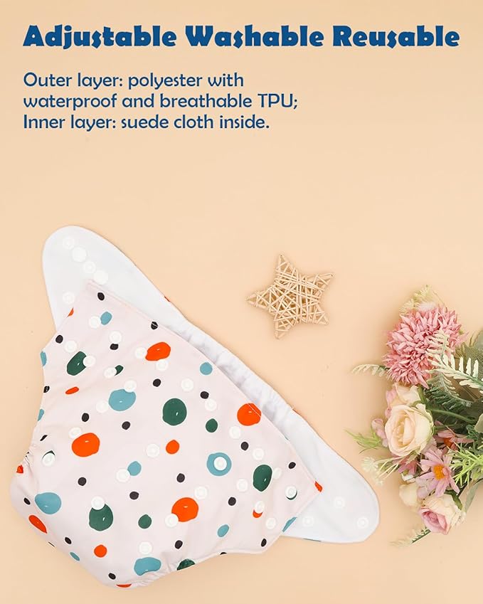 - High Quality, Adjustable, Reusable & Waterproof : Waterproof & breathable TPU outer + moisture-wicking suede cloth inner. Includes two 3-layer inserts (13.7”x5.5”) per diaper. Perfect for active parents.