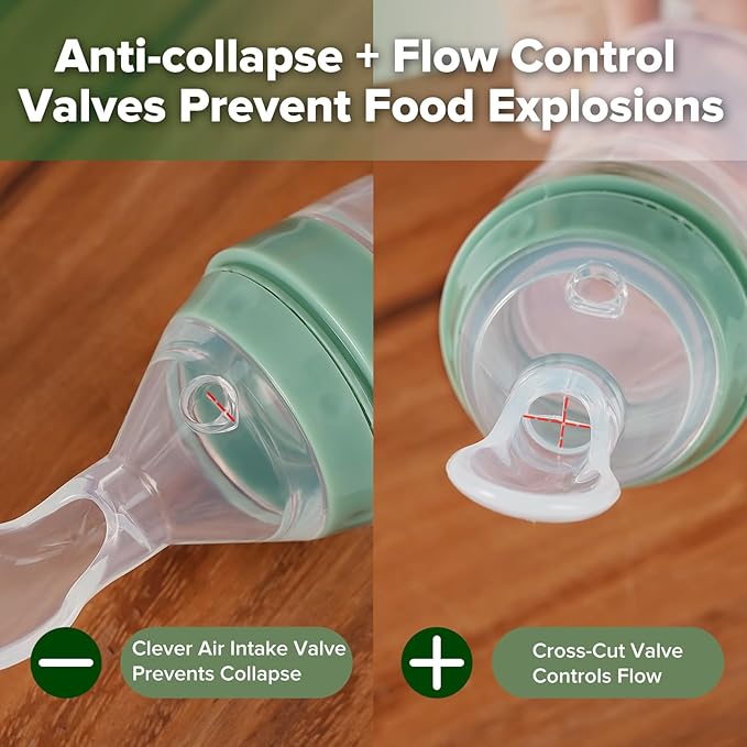 - πππππππππ ππππππ π ππ ππππ πππππππ:The innovative valve of this baby bottle spoon feeder allows air intake for quick rebound after each squeeze, while the ergonomic shape enables precise food flow control, every feeding comfortable and effortless.