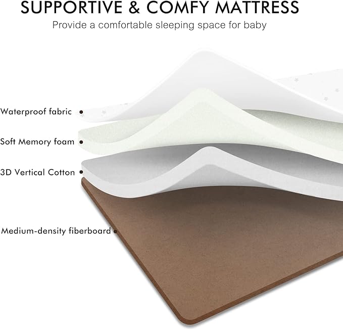 - STYLISH AND COZY - The mattress composed of memory foam and high-density foam is soft and firm for baby sleeping and comes with a waterproof sheet for easy cleaning. The sleek and minimalist design works with any nursery decor.
