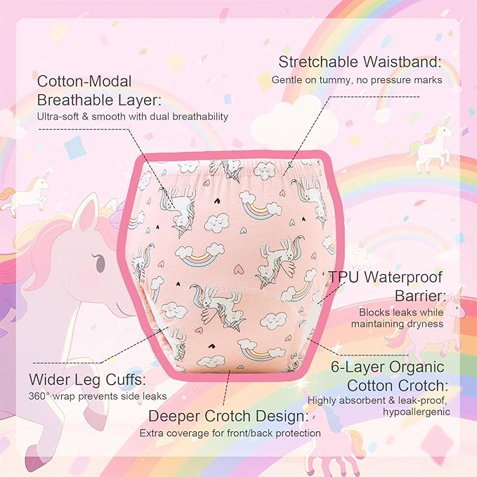 - Highly Absorbent & Leak-Proof Design: Featuring a 6-layer absorbent core, our toddler training underwear girls and boys effectively wicks away moisture and prevents leaks, giving parents peace of mind during the potty training phase.