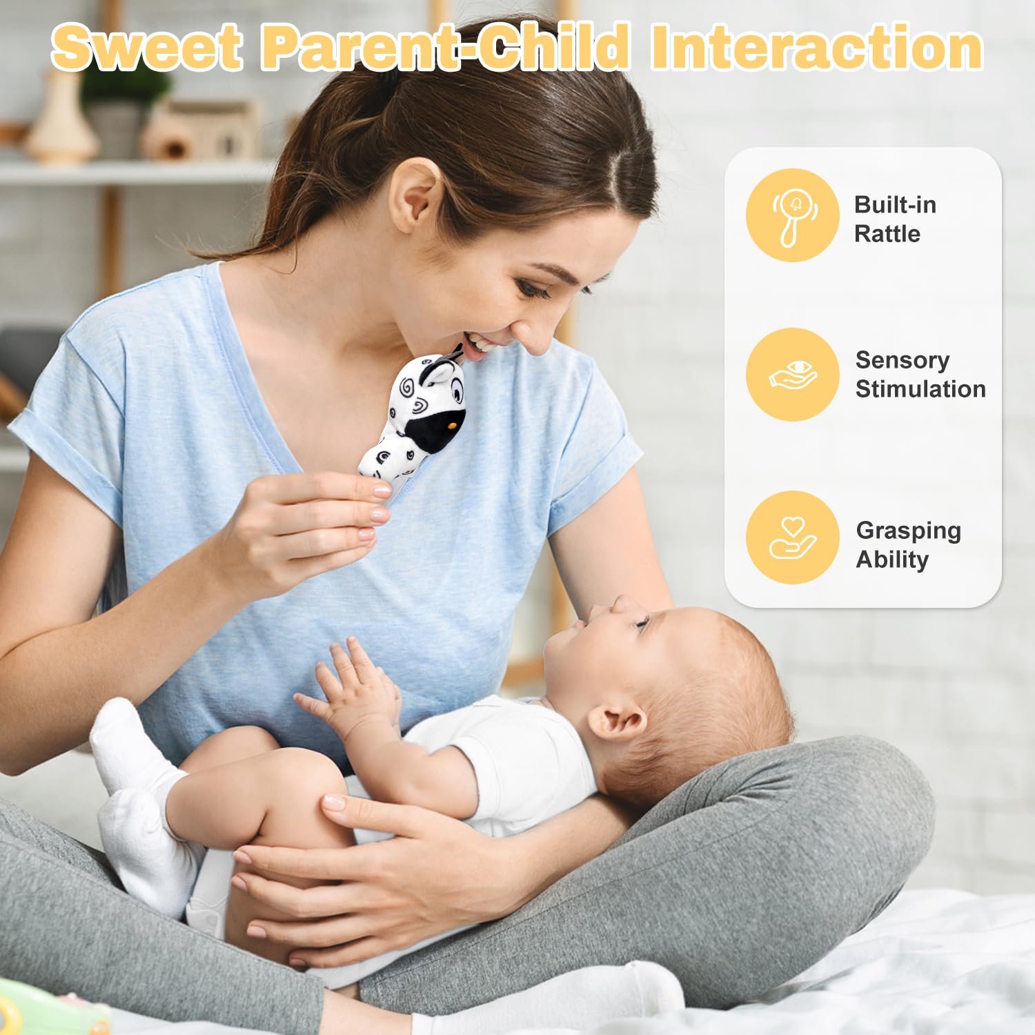 - 【High Contrast Baby Toys for Newborns】This thoughtful baby gift basket is inspired by newborn babies eye and colour recognition development. Rich black and white high contrast patterns are currently the most suitable early visual development toys for newborns, meeting the visual needs of newborns and stimulating the curiosity and attention of babies, designed to provide a combination of items for sensory play that will mesmerise and stimulate your baby’s vision development from birth